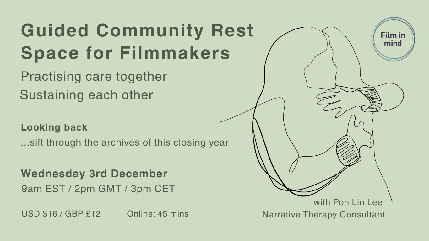 Our friends at Film In Mind are launching low-cost monthly online guided sessions - 45 minutes of shared practice designed to sustain one another through the ongoing pressures of stress and burnout. These workshops centre joy, pleasure, ease and a collective spirit, offering a space to ground and reset together.