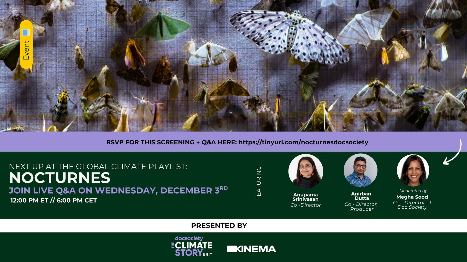 Join us for a live Q&A on Wednesday, December 3 at 12 PM ET // 6 PM CET with co-director Anupama Srinivasan and co-director and producer Anirban Dutta, moderated by Megha Agrawal Sood, Co-Director of Doc Society. Nocturnes is available to watch for a limited time as part of the Climate Story Playlist, brought to you by Kinema and the Doc Society. RSVP here